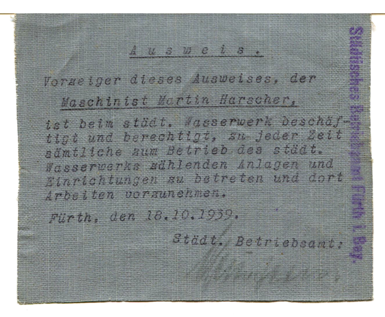 | Beschreibung | Ausweis als Maschinist bei den Städt. Wasserwerken der Stadt Fürth, 1939 | ||