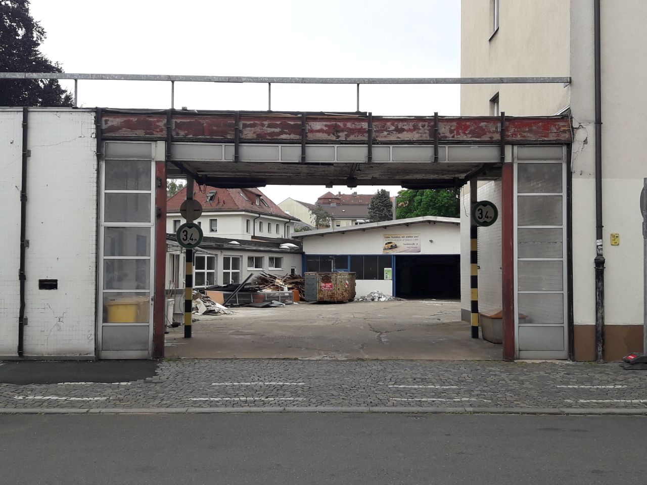 | Beschreibung | Beginnende Abbrucharbeiten auf dem ehemaligen Werksgelände des Autohauses Almank & Streng | ||