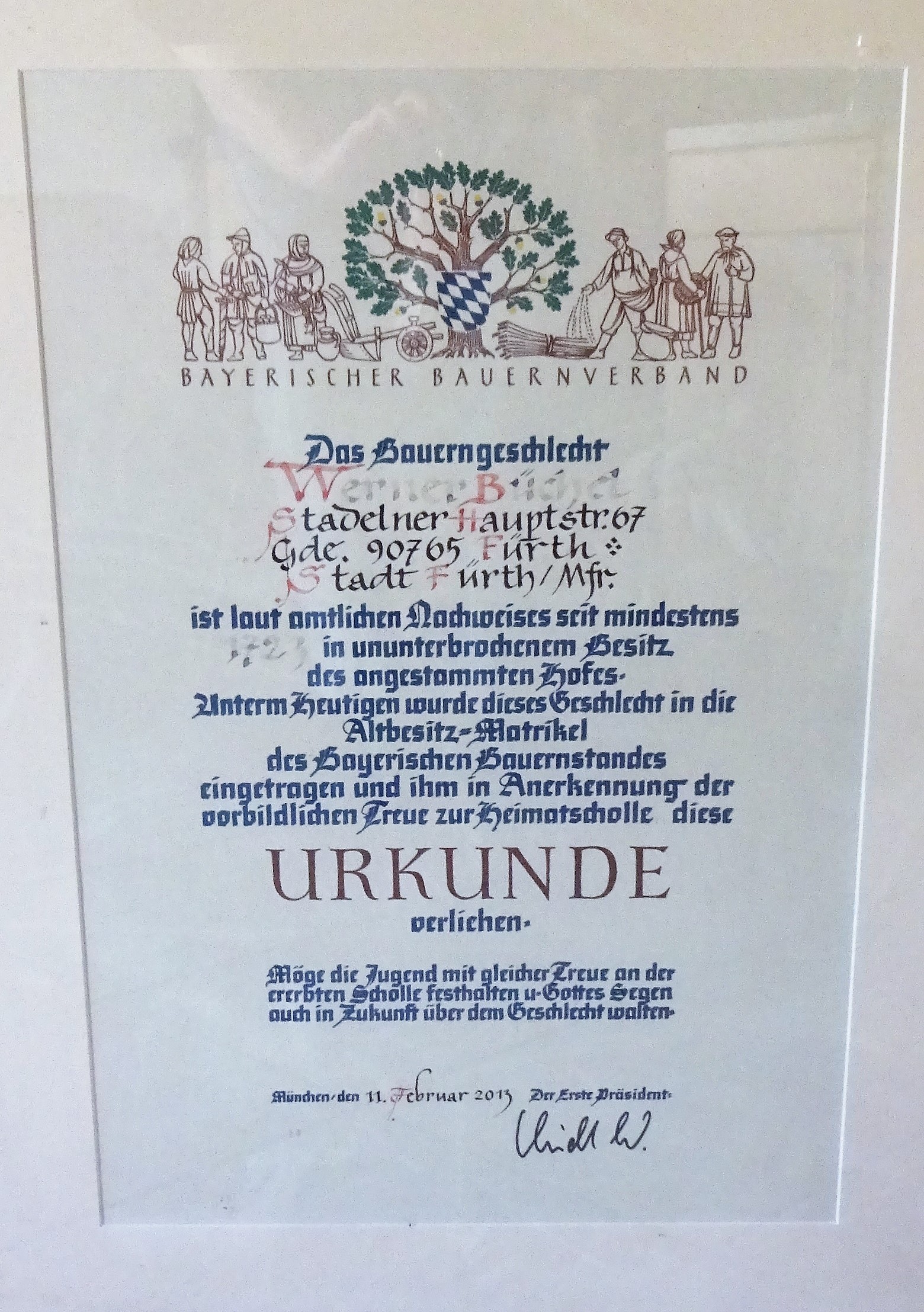 Ehrenurkunde des Bayer. Bauernverbandes für Werner Büchel vom 11.2.2013 für ununterbrochenen Besitz des angestammten Hofes seit 1723 und Eintrag in die Altbesitz-Matrikel des Bayer. Bauernstandes.