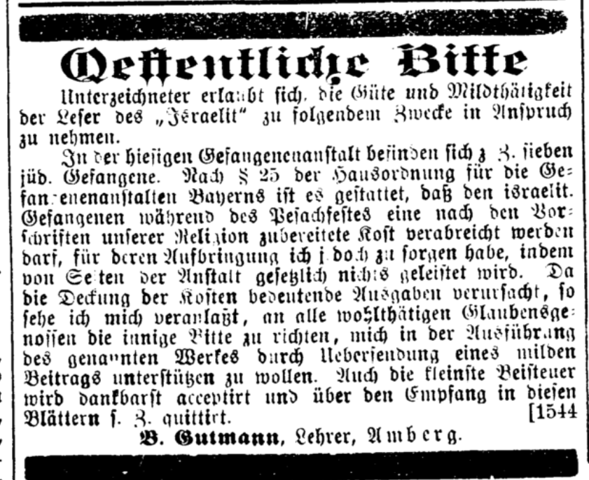 | Dateiinfo (Bild-Unterschrift und Info-Box, automatisch erstellt) | Zeitungsaufruf bezüglich Gefangenenseelsorge, Der Israelit, 15. März 1900 Urheber: B. Gutmann<br><br>Lizenz: CC BY-SA 3.0 | ||