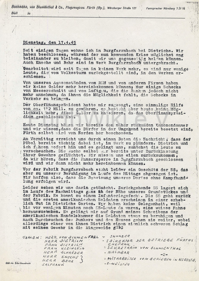 | Dateiinfo (Bild-Unterschrift und Info-Box, automatisch erstellt) | Seite 1 von 25, Tagebuch von Blumenthal, 17. April 1945 bis 29. Mai 1945. Lizenz: CC BY-SA 3.0 | ||