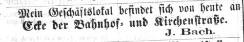 | Dateiinfo (Bild-Unterschrift und Info-Box, automatisch erstellt) | J. Bach Ecke Bahnhof- und Kirchenstraße, September 1869 Lizenz: NoC-NC 1.0 | ||