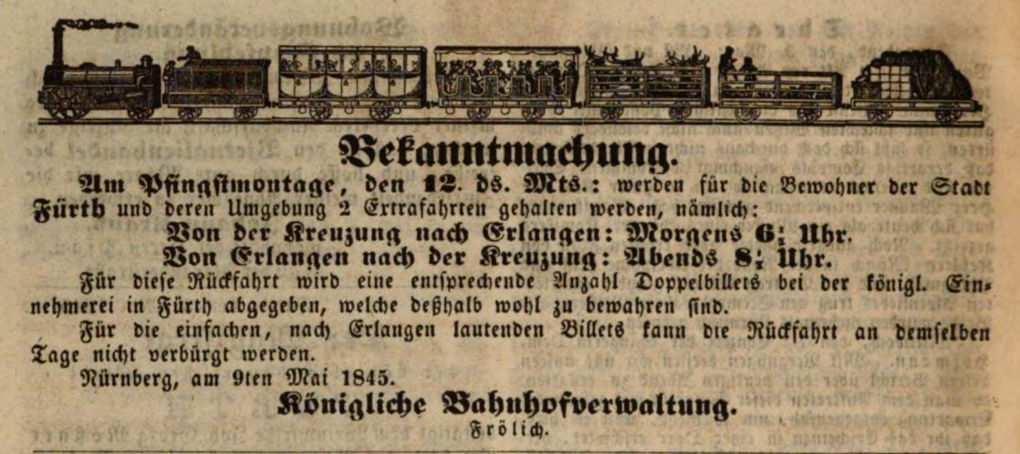 | Beschreibung | Bekanntmachung einer Sonderfahrt mit der Ludwig-Süd-Nord-Bahn, Mai 1845 | ||