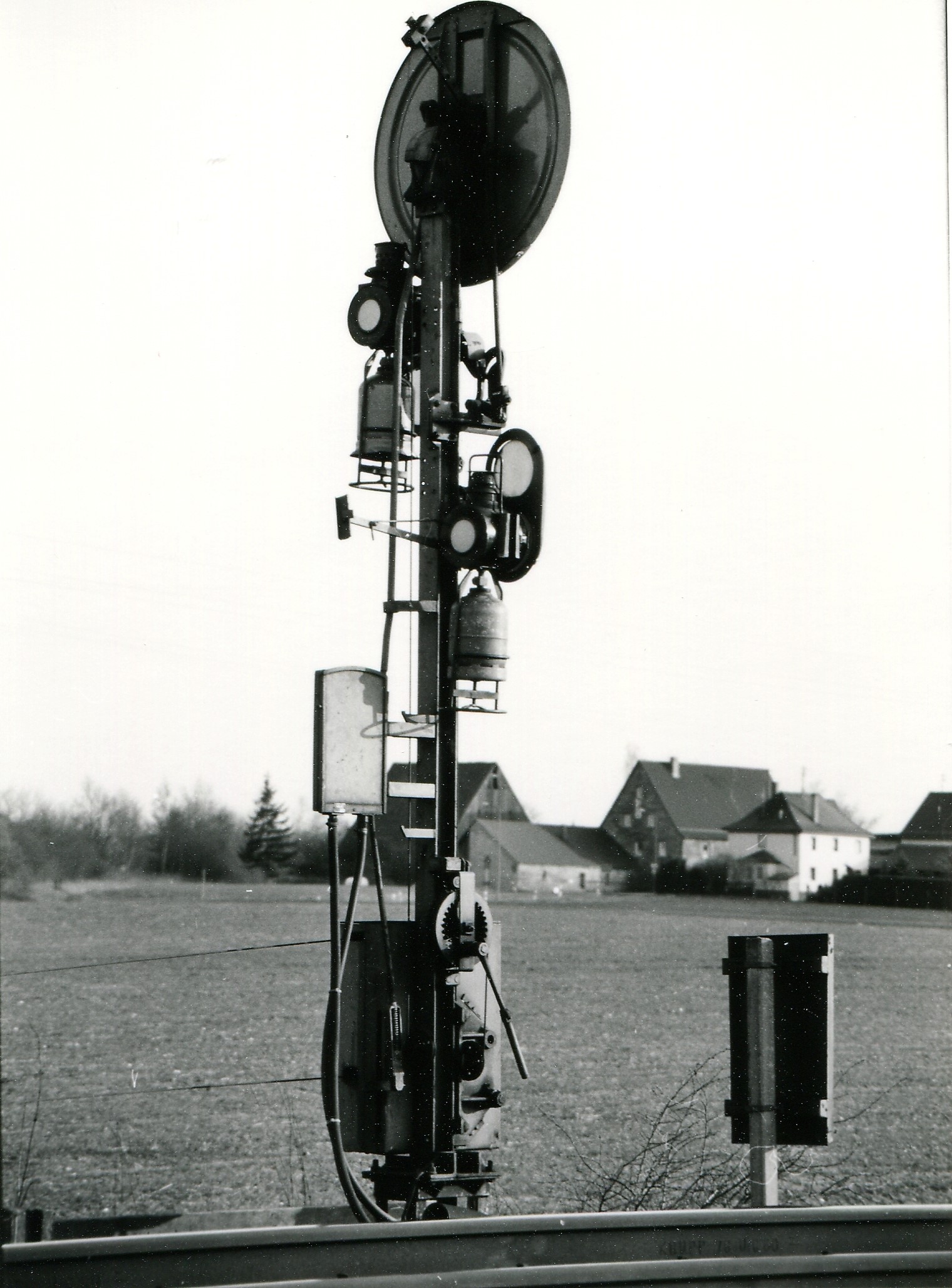 1991: Detailaufnahme eines alten Formvorsignales, die alle auch im Bahnhofsbereich im Laufe des Jahres 1998 demontiert und mit Lichtsignale neuester Technik erneuert wurden. Alte Technik wie Signalscheibe, Gewichte, Blendeneinrichtungen rot/grün, Propangasflaschen für die Beleuchtung für ca. 6 Wochen, die elektrische Zündung dazu, die Umlenkpunkte für die Drahtzugleitungen zum verstellen und vieles mehr an Mechanik wurde Schrott. Im Hintergrund Herboldshof.