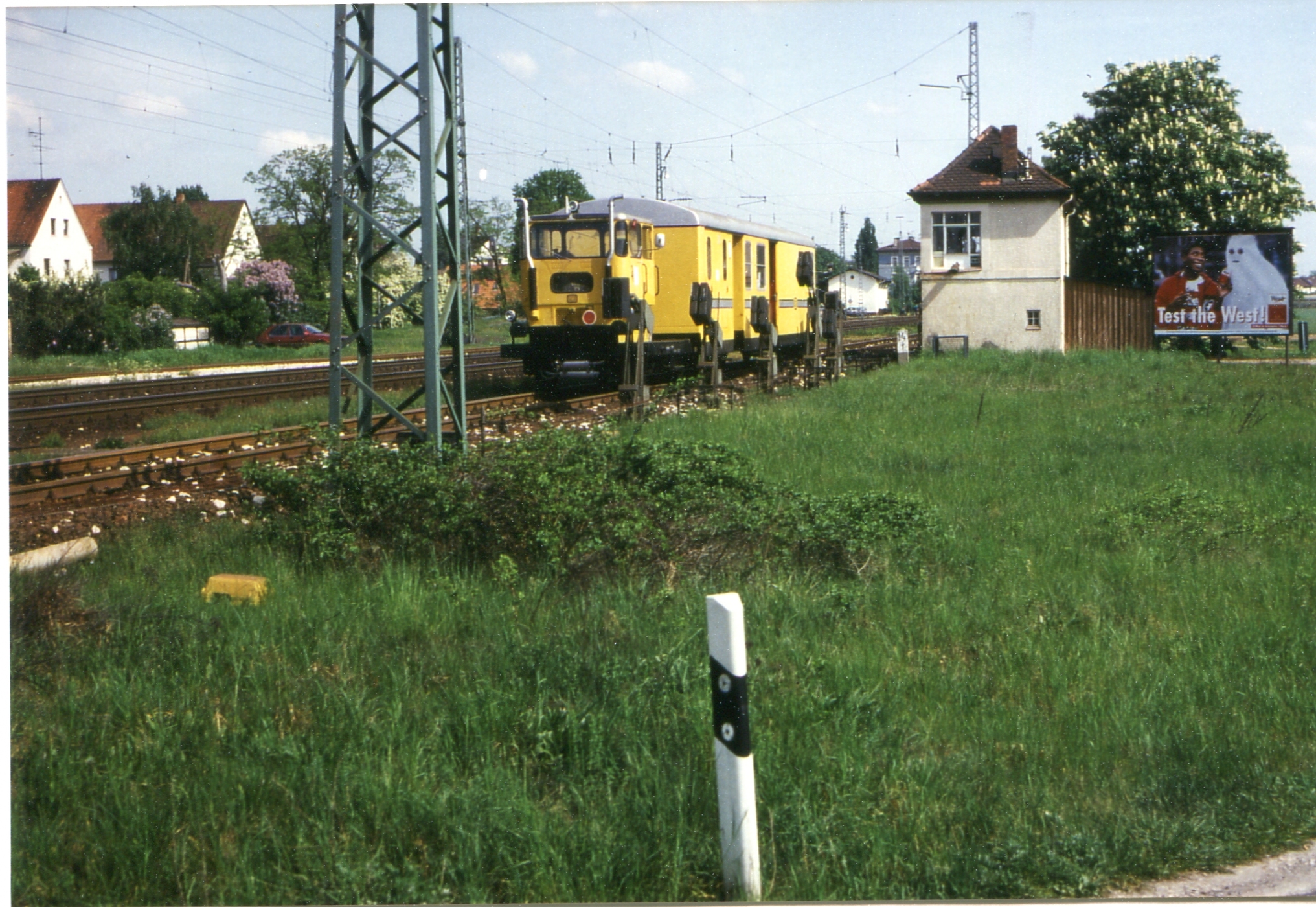 1992: Bauwagen vor dem ehemaligen Stellwerk 1 am Bahnhof Vach nach dem Bahnübergang nach Steinach. Vor dem Gebäude die gewichtsbelastenden Spannwerke für die Drahtzugleitungen, die über lange Strecken zu den Weichen und Signalen geführt wurden.