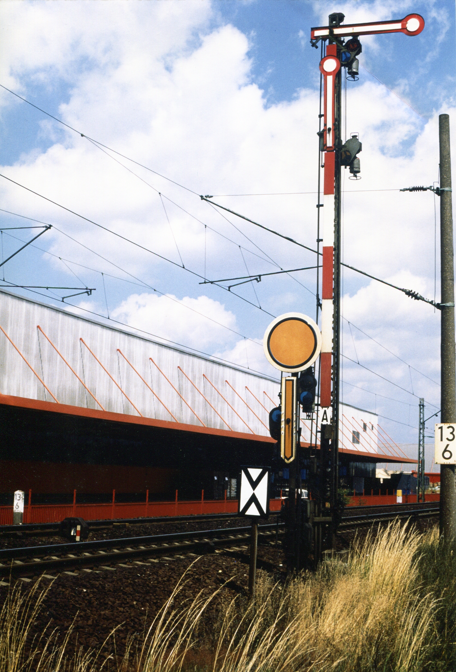 | Dateiinfo (Bild-Unterschrift und Info-Box, automatisch erstellt) | Formsignal mit Stellung "Halt" und Formvorsignal mit Stellung "Halt erwarten" vor dem Bahnhof Vach ... Formsignal mit Stellung "Halt" und Formvorsignal mit Stellung "Halt erwarten" vor dem Bahnhof Vach ca. 1990 mit Lagerhalle der Firma BIG. Die Signalflügel und die Stellscheibe des Vorsignals sind emailliert und damit ausbleichsicher.<br>Urheber: Michael Smolarczik<br><br>Lizenz: CC BY-SA 3.0 | ||