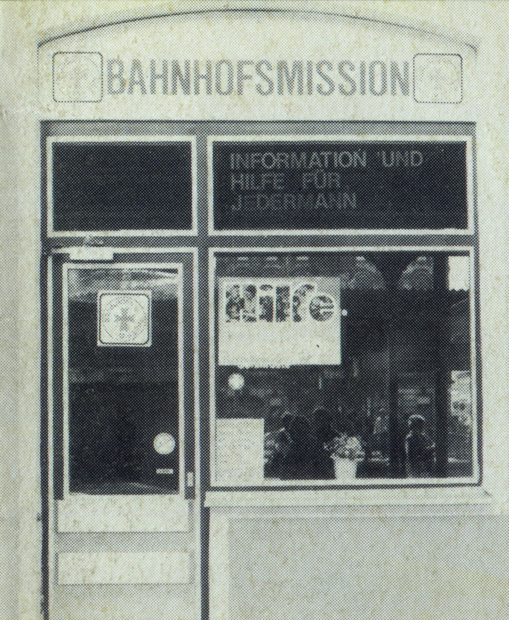 | Dateiinfo (Bild-Unterschrift und Info-Box, automatisch erstellt) | Der Eingang zur Bahnhofsmission Fürth, ca. 1980 Urheber: unbekannt<br><br>Lizenz: CC BY-SA 3.0 | ||