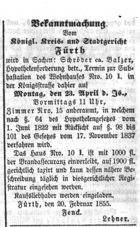 | Beschreibung | Öffentliche Ausschreibung der Zwangsversteigerung Königstraße 10, Fürther Tagblatt 4.3.1855 | ||