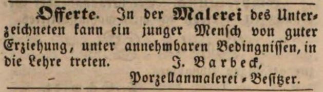 | Beschreibung | Werbeanzeige des Porzellanmalerei-Besitzers Johann Michael Barbeck, 1846 | ||