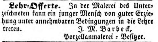 | Beschreibung | Werbeanzeige des Porzellanmalerei-Besitzers Johann Michael Barbeck, 1851 | ||