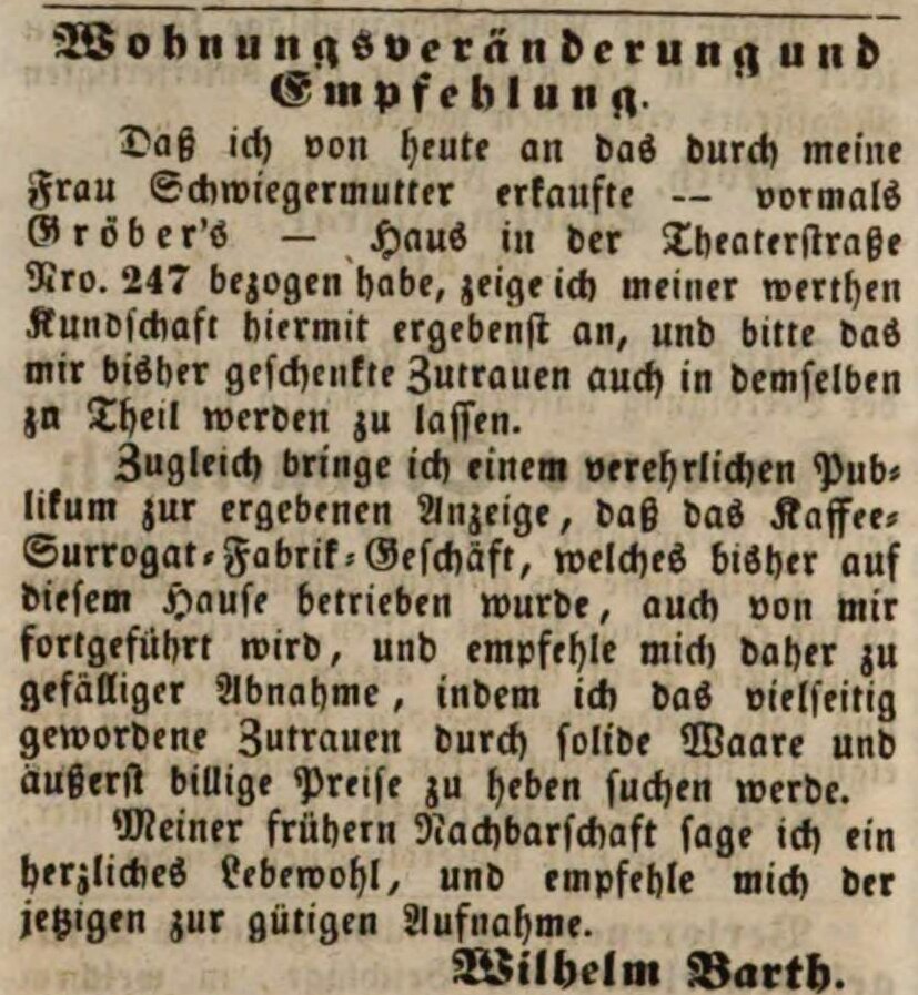 | Beschreibung | Wilhelm Barth übernimmt das "Kaffee-Surrogat-Fabrik-Geschäft", Februar 1846 | ||