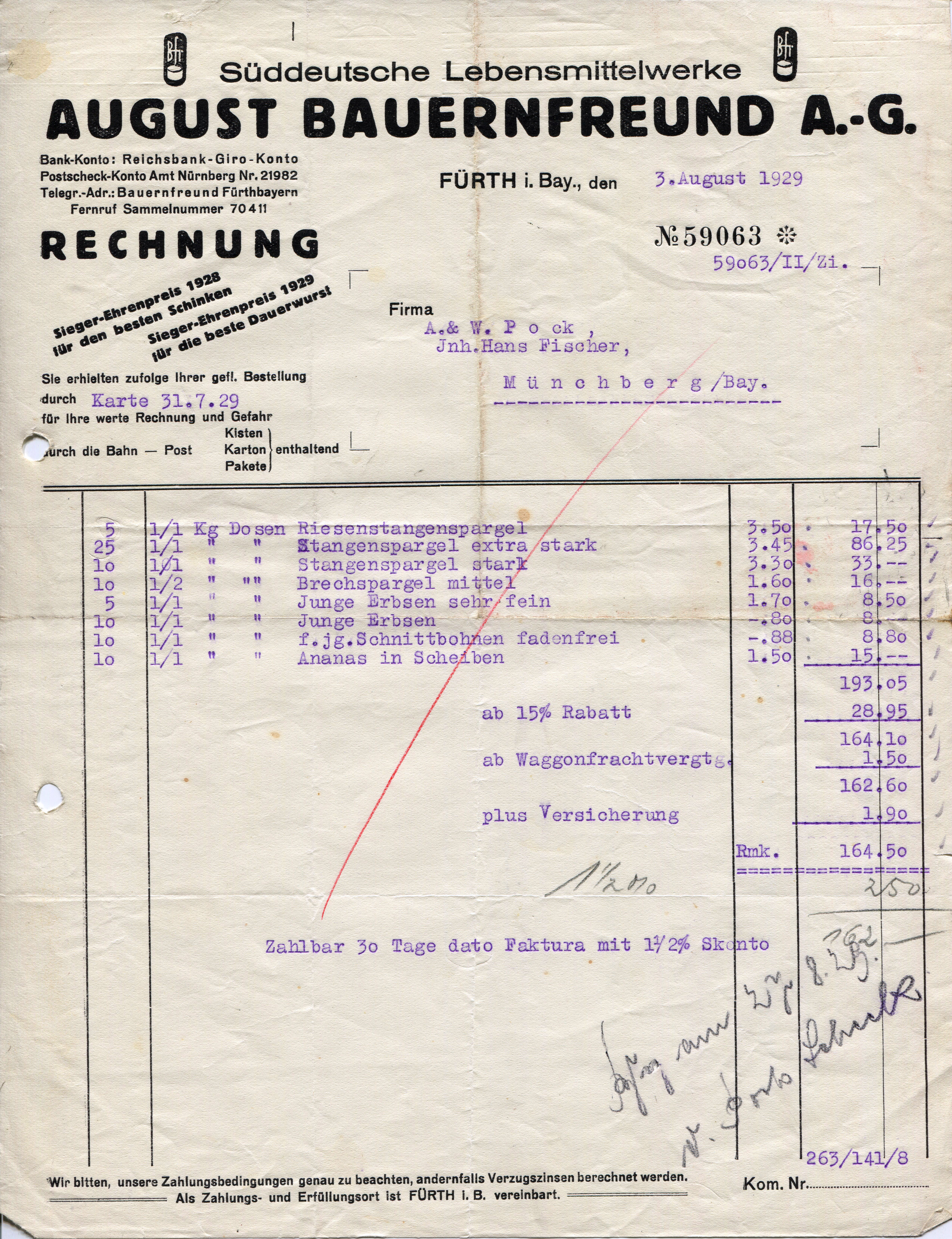 | Beschreibung | Rechnung der Firma Bauernfreund, 1929 | ||
