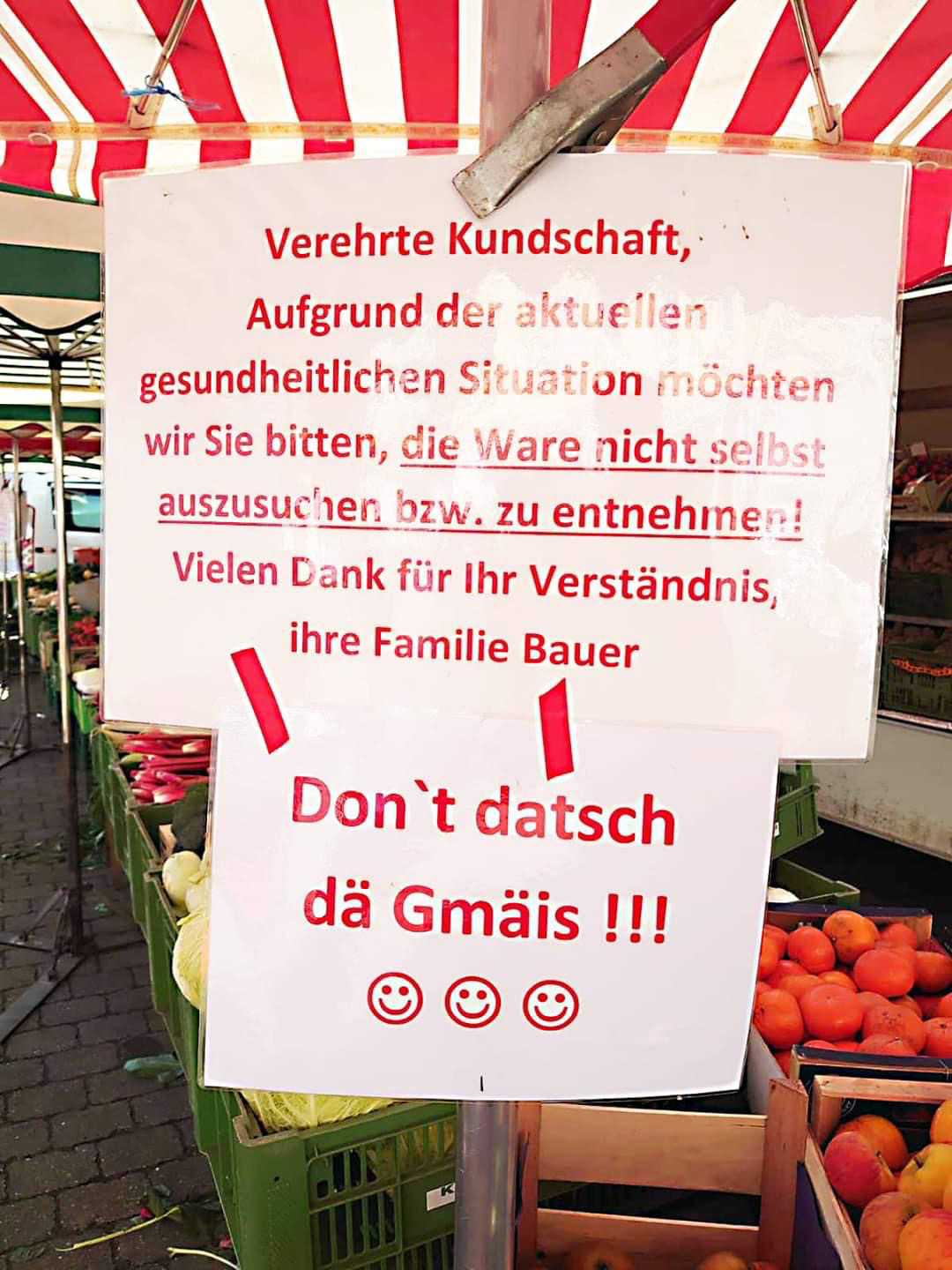 | Beschreibung | Hinweisschild am Bauernmarkt in Sachen COVID-19, April 2020 | ||