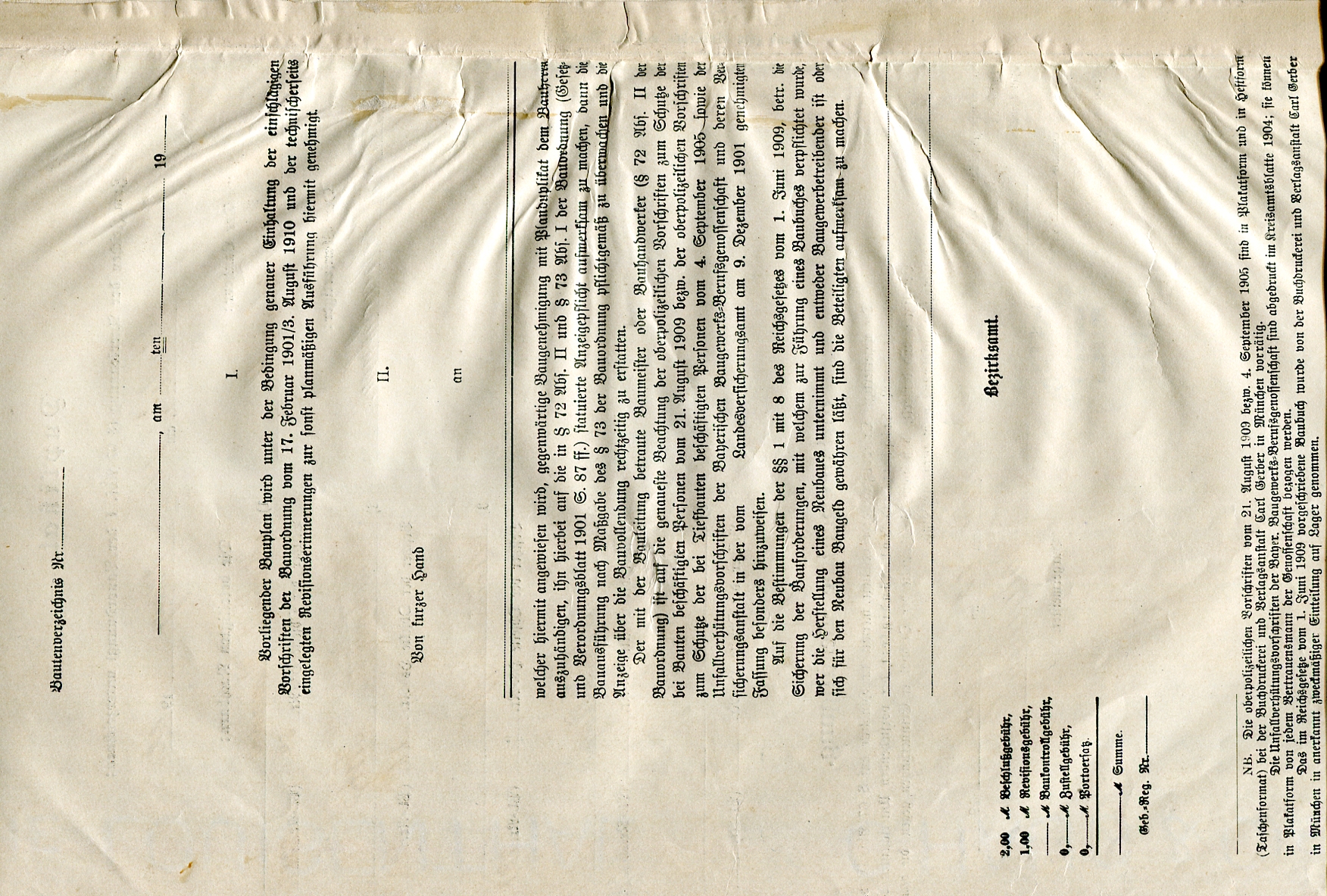 Bauplan 1922 der Gaststätte Zur Eisenbahn Stadeln am Bahnhof Vach und "Verwaltungsakt" zur Errichtung einer Einfriedung (Zaun)