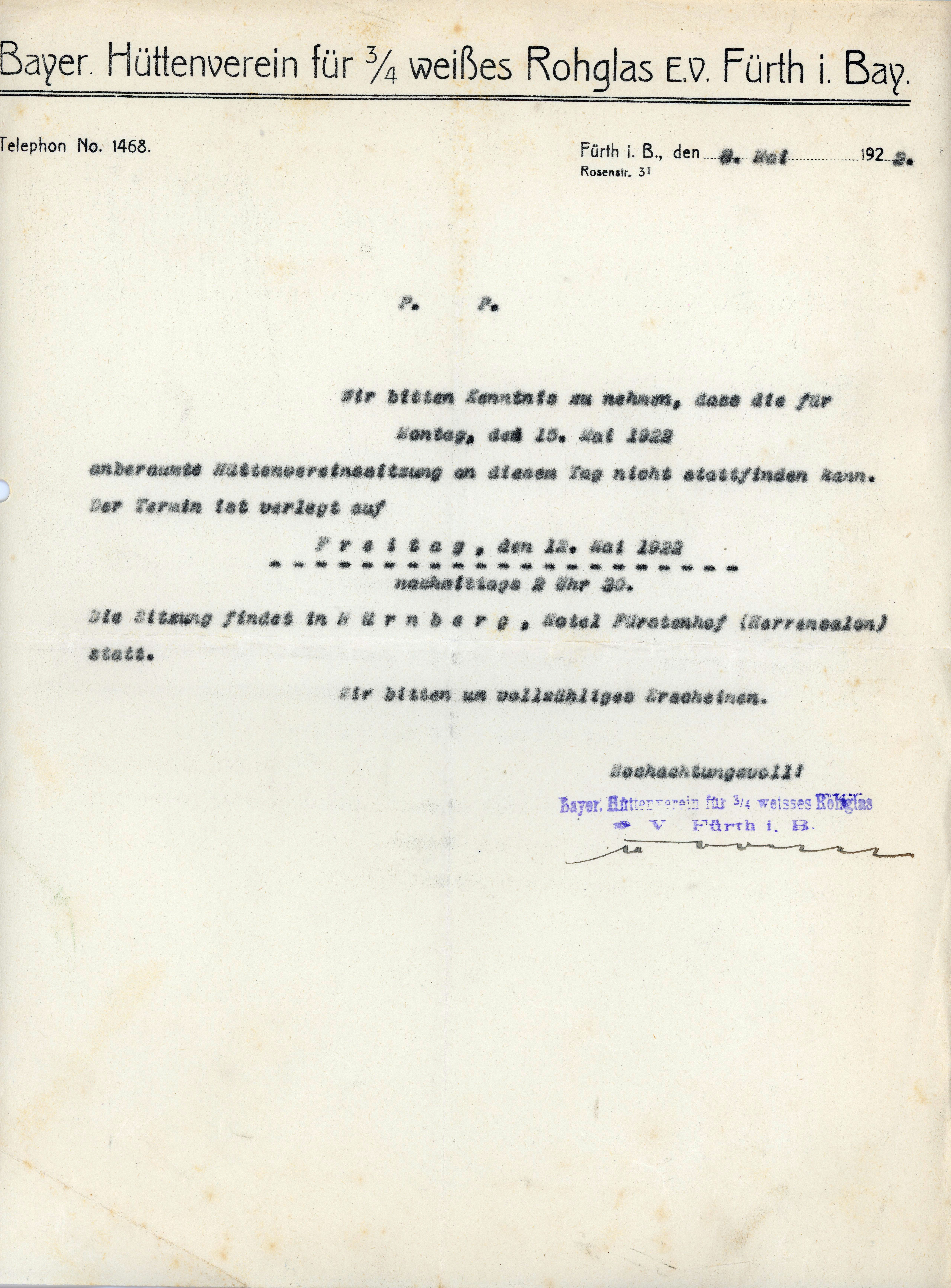| Beschreibung | Einladungsschreiben zur Hüttenvereinssitzung des Bayerischen Hüttenvereins für 3/4 weißes Rohglas e. V. in Fürth, 1922 | ||