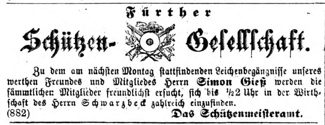 | Beschreibung | Aufruf der Schützengesellschaft zur Beerdigung von Simon Gieß vom 21. Februar 1875 | ||