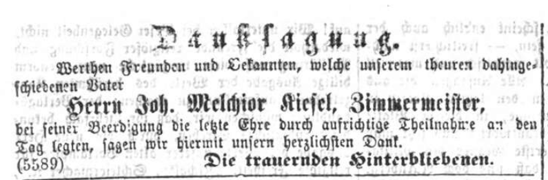 | Beschreibung | Danksagung zur Beerdigung von Joh. Melchior Kiesel vom 3. Okt. 1872 | ||