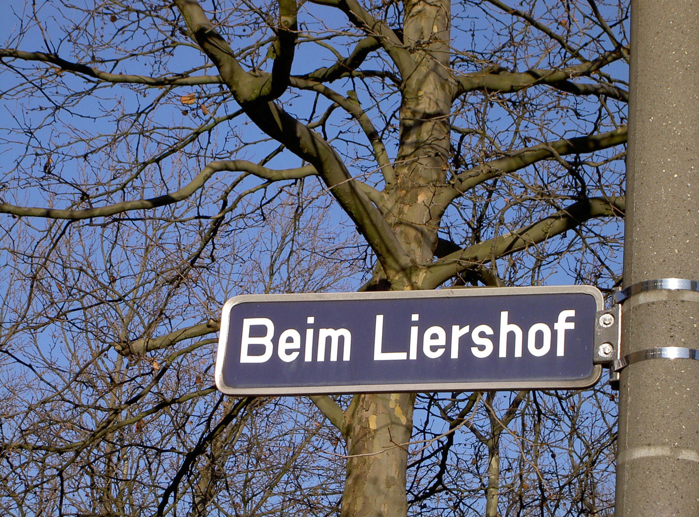 | Dateiinfo (Bild-Unterschrift und Info-Box, automatisch erstellt) | Straßenschild Beim Liershof Urheber: Baringel<br><br><br>Lizenz: CC BY-SA 3.0 | ||