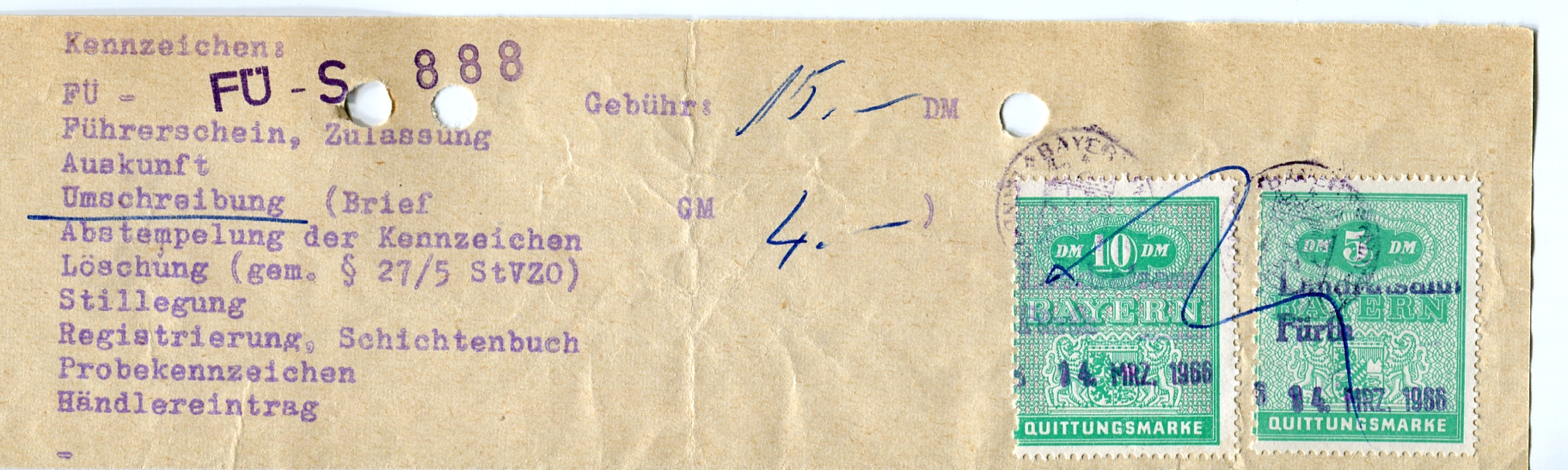 | Beschreibung | platzsparender Beleg und Quittungsmarken für Kfz.-Ummeldung vom Landratsamt Fürth 1966. | ||