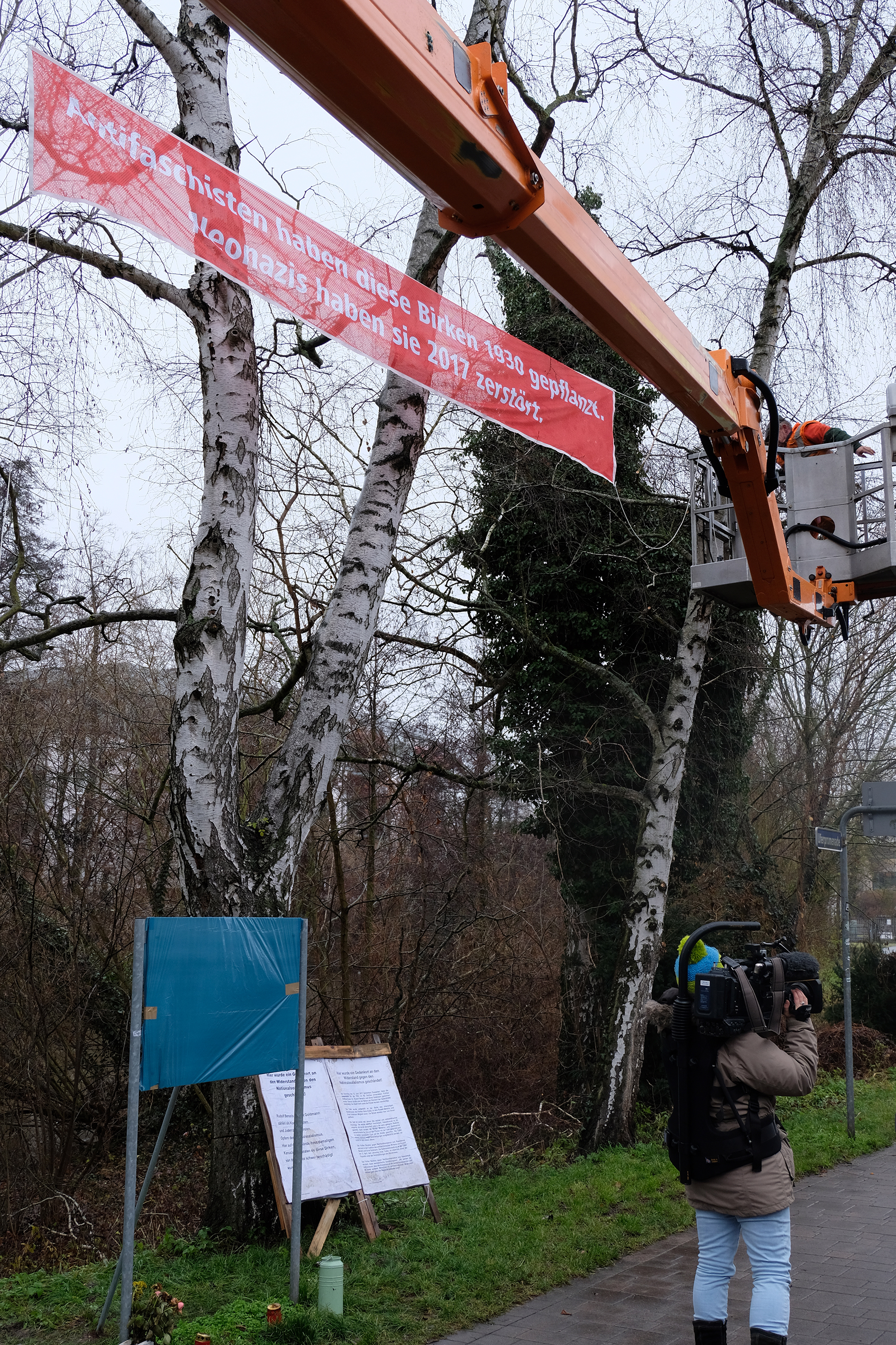 | Beschreibung | Das inzwischen (Jan. 2018) entwendete Banner zu Gedenken an die im KZ ermordeten Fürther Juden Benario und Goldmann an der Gedenkstätte an der Uferpromenade | ||