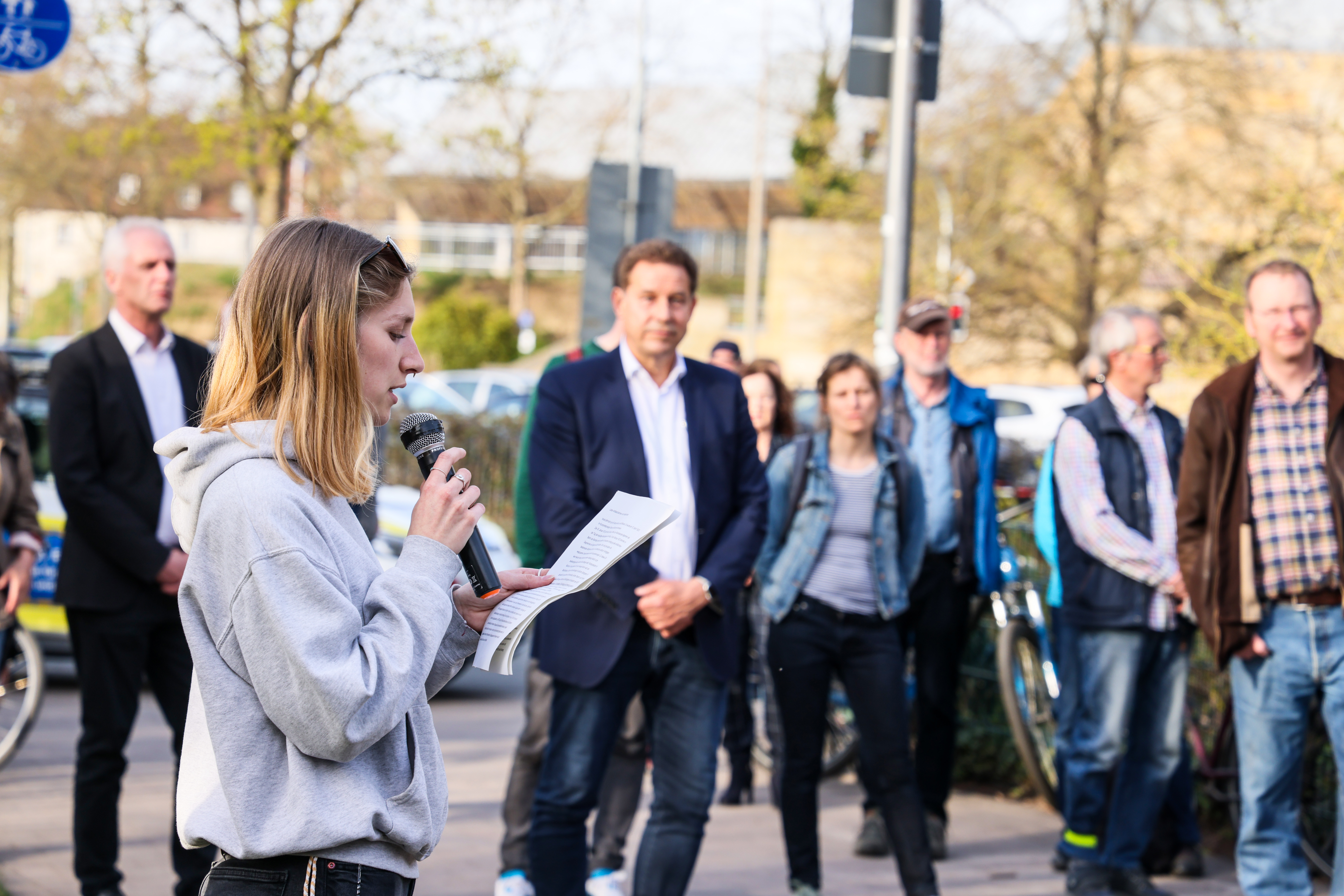| Beschreibung | Sprecherin der Antifaschistischen Linken Fürth am Gedenken an Dr. Rudolf Benario und Ernst Goldmann an der Uferpromenade, April 2022 | ||