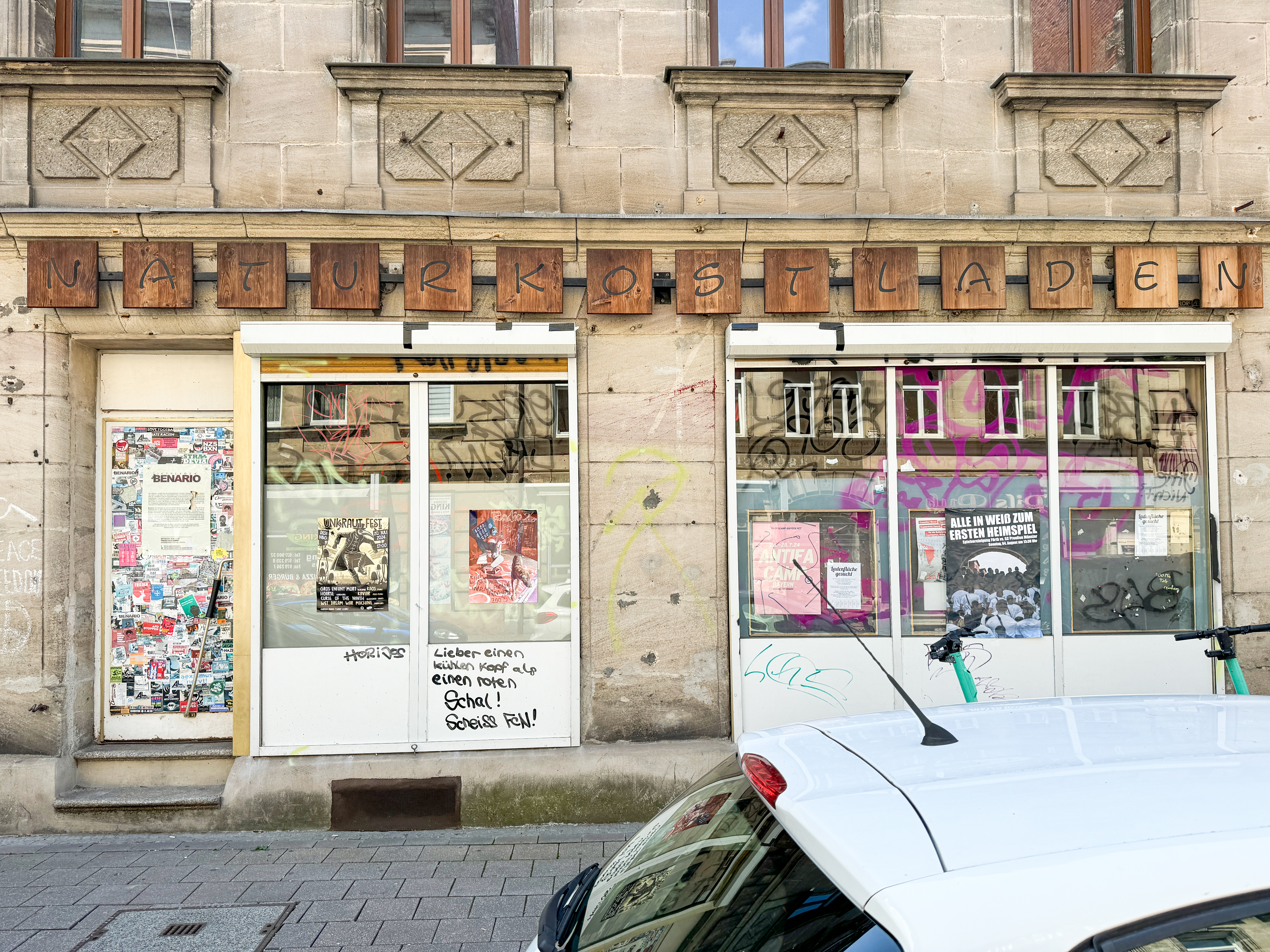 | Beschreibung | Alte Werbung des Naturkostladens erscheint an der Fassade nach der Entfernung der Außenwerbung am Infoladen Benario, Juli 2024 | ||