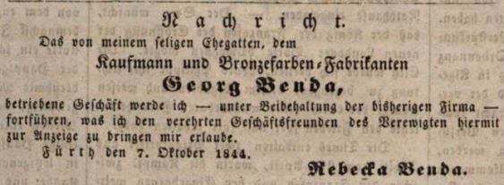 | Dateiinfo (Bild-Unterschrift und Info-Box, automatisch erstellt) | Zeitungsanzeige von Rebecka Benda, Witwe des Bronzefarbenfabrikanten Georg Benda, Oktober 1844 Lizenz: NoC-NC 1.0 | ||