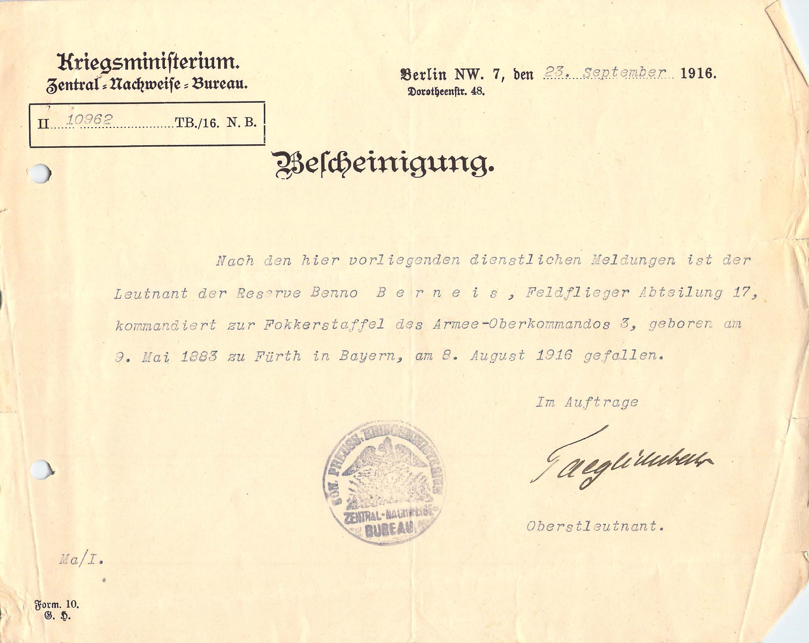 | Beschreibung | Todesbescheinigung bzgl. Benno Berneis, September 1916 | ||
