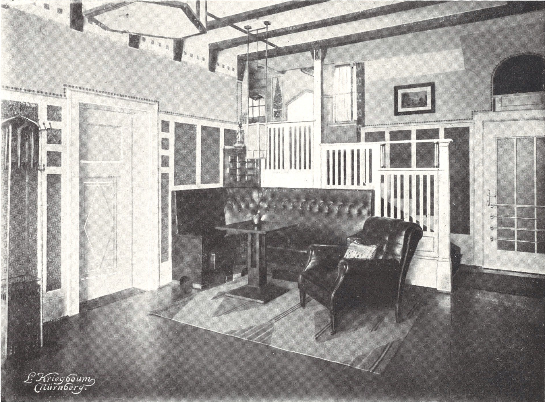 | Dateiinfo (Bild-Unterschrift und Info-Box, automatisch erstellt) | Ansicht der Diele aus dem Landhaus Brünn, Forsthausstr. 40, Aufnahme um 1907 Urheber: L. Kriegbaum, Nürnberg<br><br>Lizenz: CC BY-SA 3.0 | ||