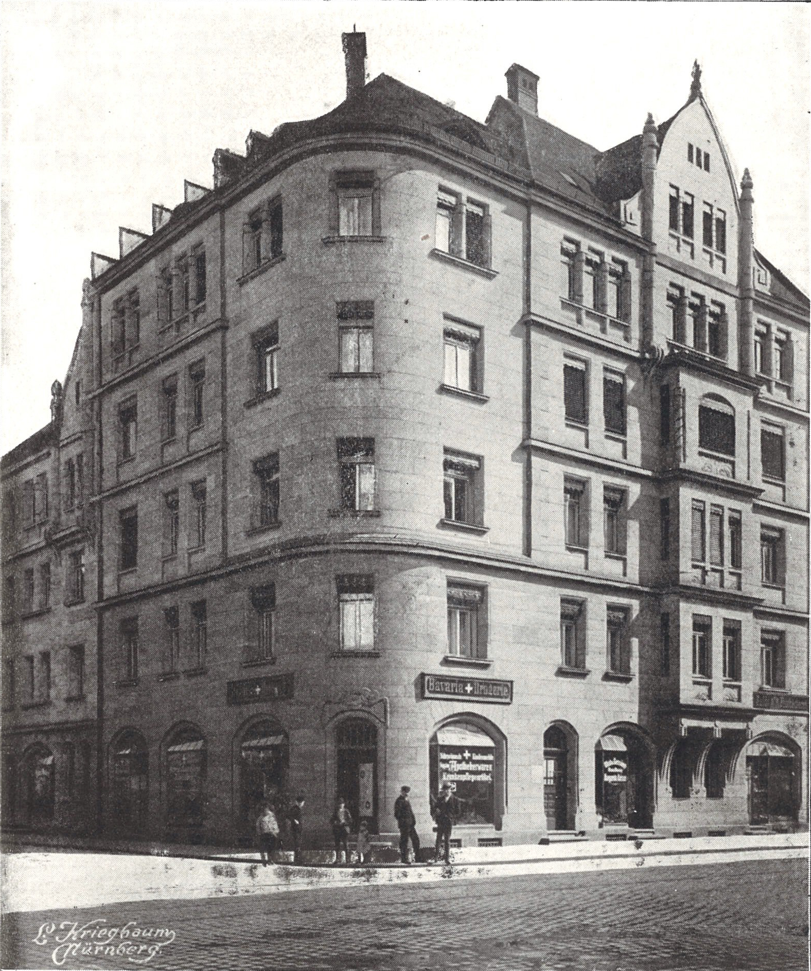 | Beschreibung | Wohnhaus, Schwabacher Str. 65 mit Blick in die Lessingstraße, Baumeister Ammon, Am Eck die ehem. Bavaria Drogerie, Aufnahme um 1907 | ||