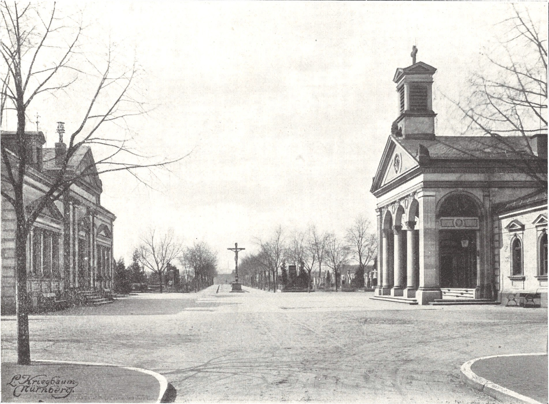 | Dateiinfo (Bild-Unterschrift und Info-Box, automatisch erstellt) | Städtischer Friedhof, Erlanger Str. 97, Platz zwischen Leichen- und Wartehalle, Aufnahme um 1907 Urheber: L. Kriegbaum, Nürnberg<br><br>Lizenz: CC BY-SA 3.0 | ||