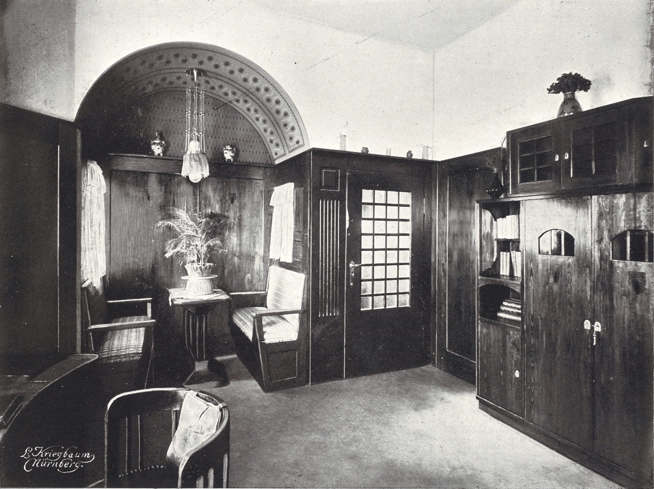 | Dateiinfo (Bild-Unterschrift und Info-Box, automatisch erstellt) | Herrenzimmer aus dem Landhaus Dr. Georg Soldan, Berolzheimerstr. 12, Aufnahme um 1907 Urheber: L. Kriegbaum, Nürnberg<br><br>Lizenz: CC BY-SA 3.0 | ||