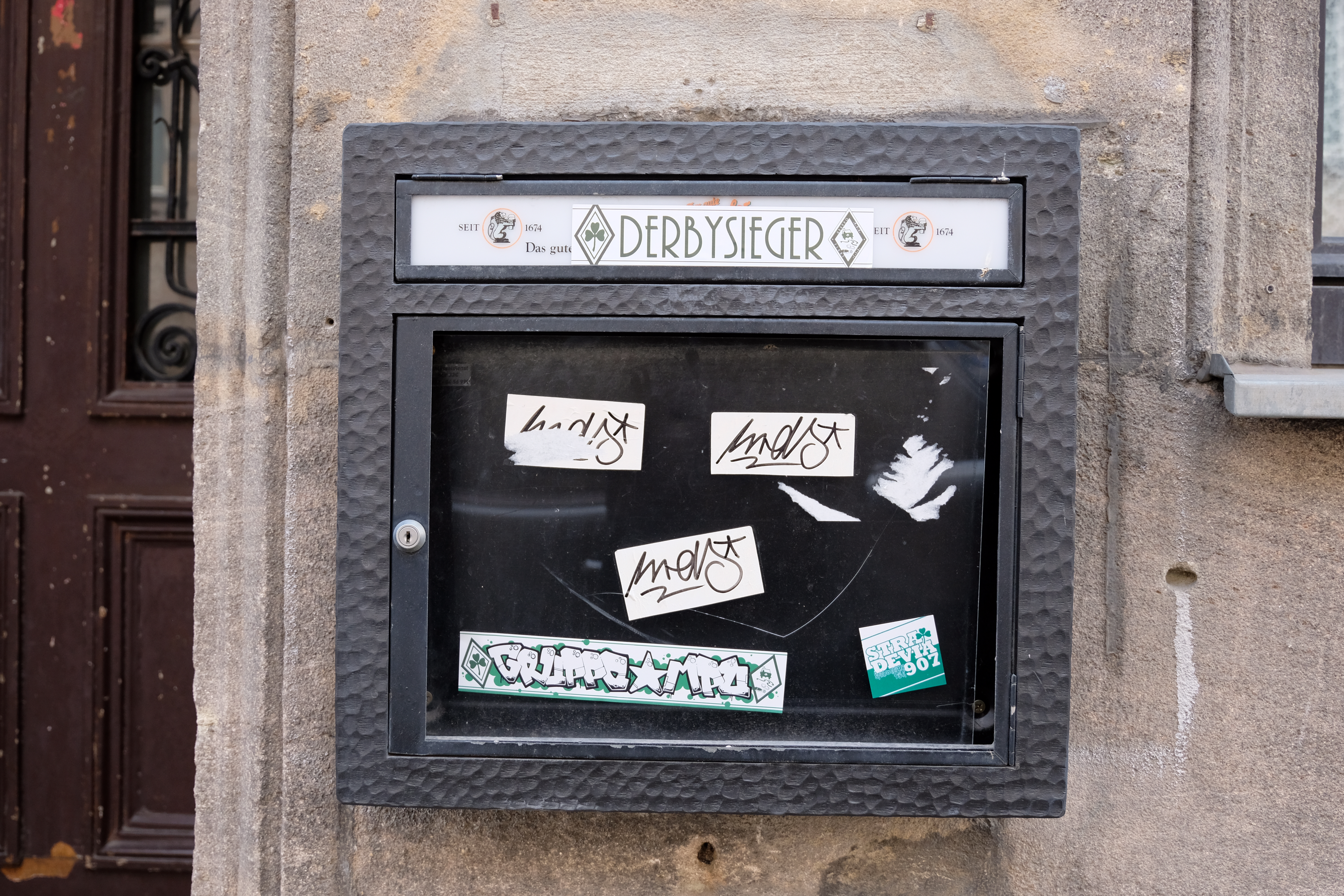 | Beschreibung | Speisekartenanzeigen bei der ehem. Gaststätte Zum Herrenstüberl in der Blumenstraße 19 - inzwischen mit Aufklebern der Spielvereingiungsfangruppierungen überklebt, April 2018 | ||