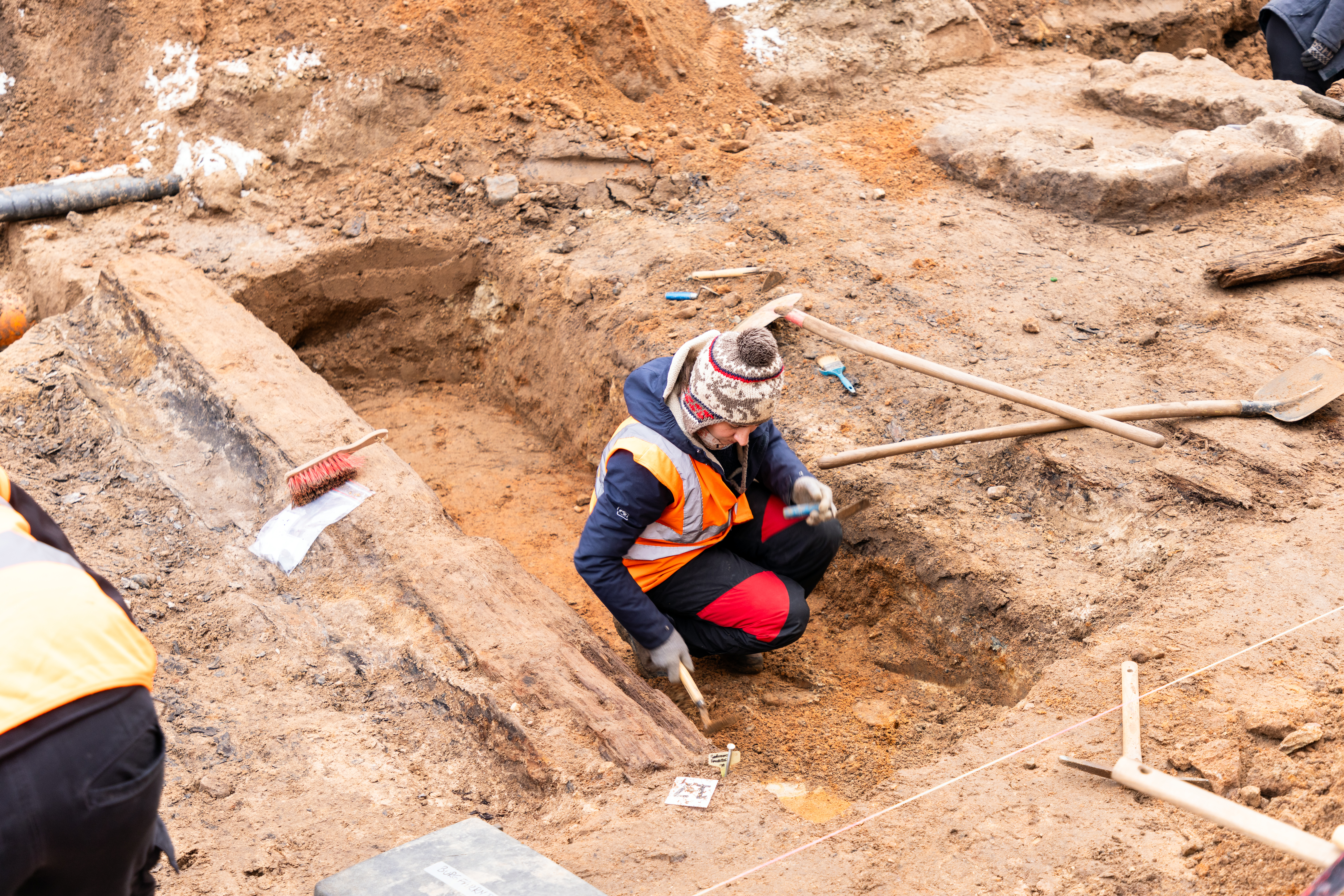 | Beschreibung | Archäologische Ausgrabungsarbeiten in Würzburg Straße in Burgfarrnbach - links im Bild ist noch gut eine Holzbohle zu erkennen, Dez. 2023 | ||