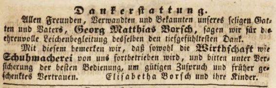 | Beschreibung | Zeitungsanzeige der Witwe von Georg Matthias Borsch, November 1841 | ||