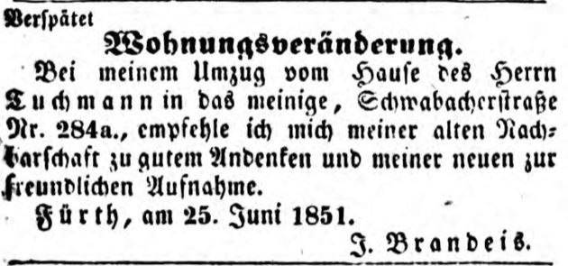 | Beschreibung | Zeitungsanzeige von J. Brandeis, Juli 1851 | ||
