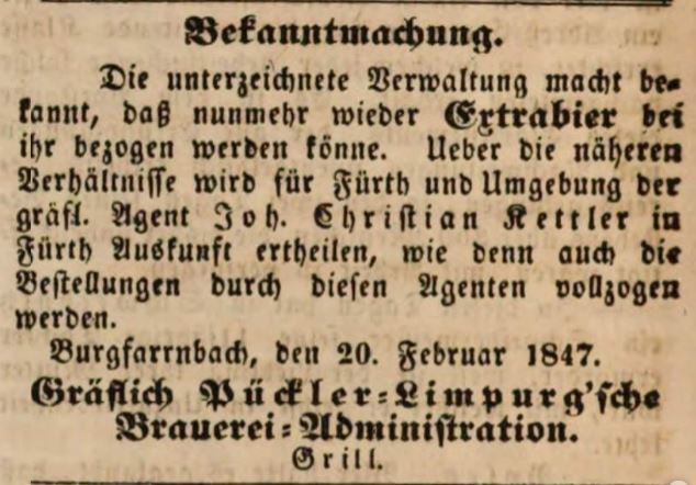 | Dateiinfo (Bild-Unterschrift und Info-Box, automatisch erstellt) | Zeitungsanzeige der Gräflich Pückler-Limpurg'sche Brauerei, Februar 1847 Lizenz: Out of copyright - non commercial re-use | ||