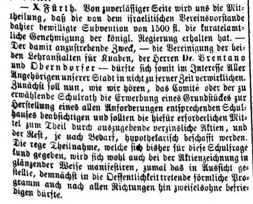| Dateiinfo (Bild-Unterschrift und Info-Box, automatisch erstellt) | amtliche Mitteilung zur Fusion zweier Erziehungsinstitute, Fürther Tagblatt 25.4.1861 Urheber: Fürther Tagblatt<br><br>Lizenz: CC BY-SA 3.0 | ||