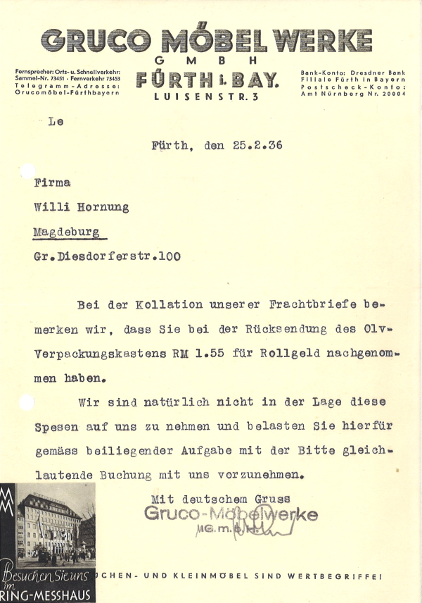 | Beschreibung | Geschäftsbrief der Fa. GRUCO MÖBEL WERKE von 1936 | ||