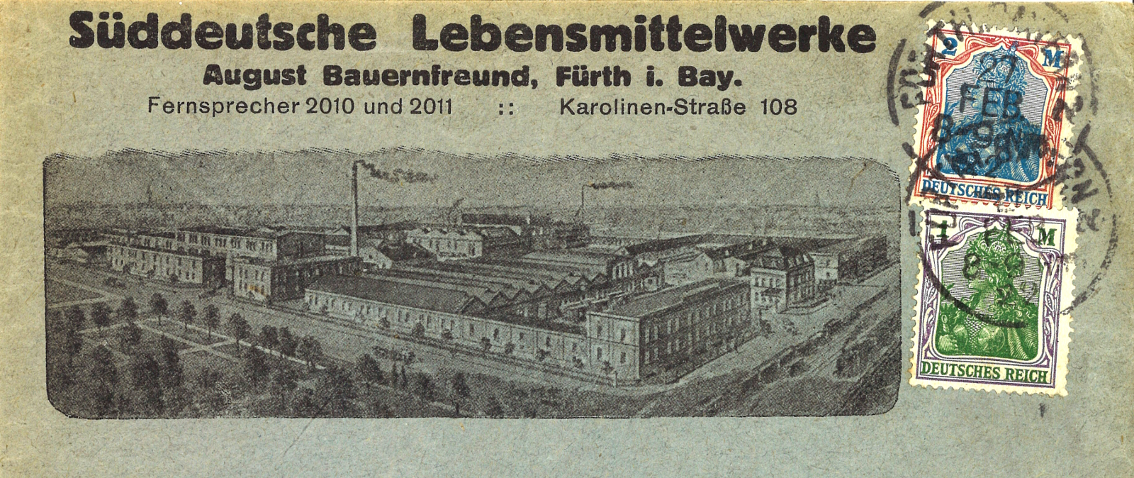 | Dateiinfo (Bild-Unterschrift und Info-Box, automatisch erstellt) | Firmenkomplex der Süddeutschen Lebensmittelwerke (Brief von 1922), vorher Maschinenfabrik ... Firmenkomplex der Süddeutschen Lebensmittelwerke (Brief von 1922), vorher Maschinenfabrik Engelhardt, danach Fränkische Pelzindustrie - in der Bildmitte verläuft die Gießereistraße<br>Urheber: Süddeutsche Lebensmittelwerke<br><br>Lizenz: CC BY-SA 3.0 | ||
