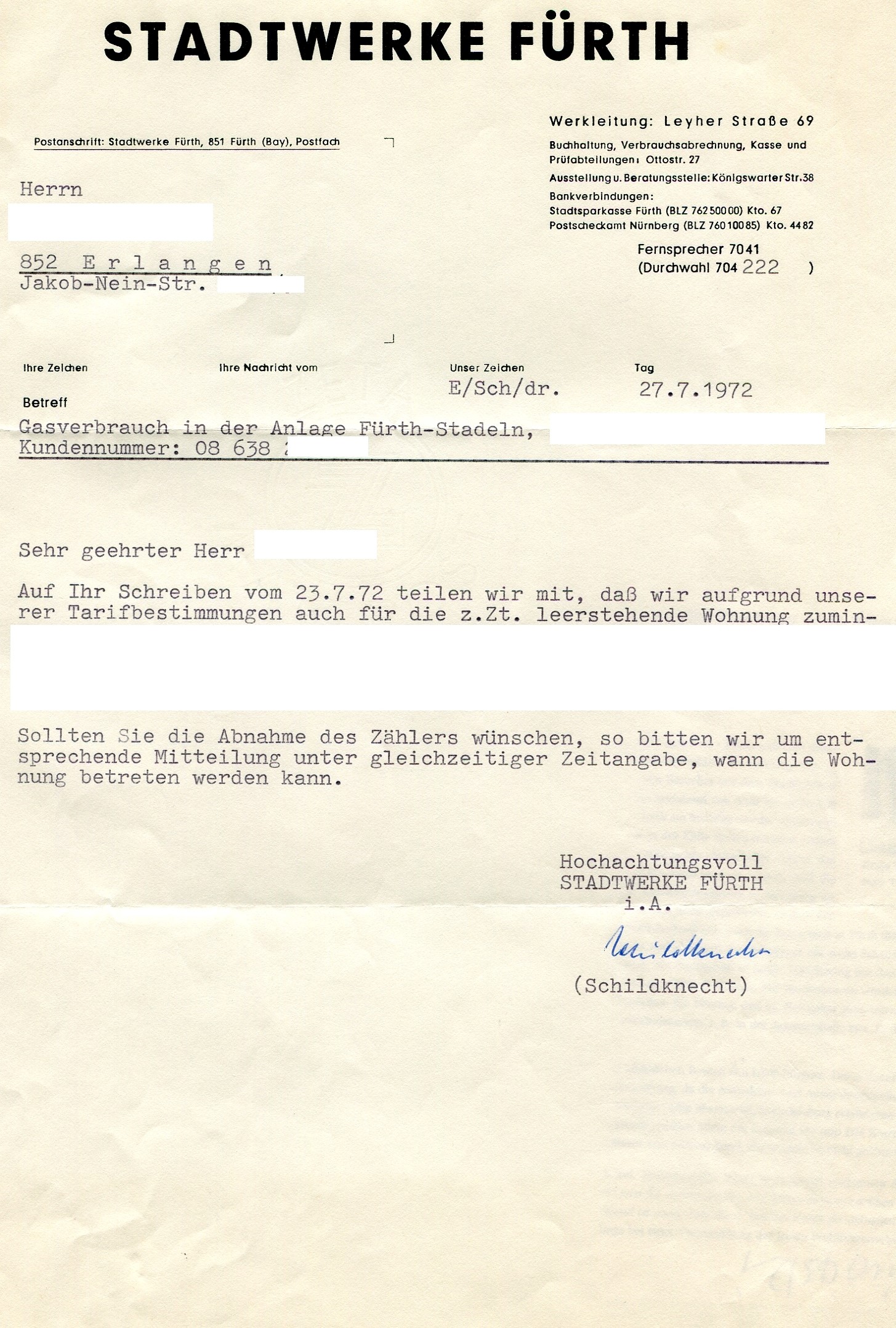 Briefbogen der Stadtwerke Fürth jetzt Infra fürth gmbh vom Juli 1972