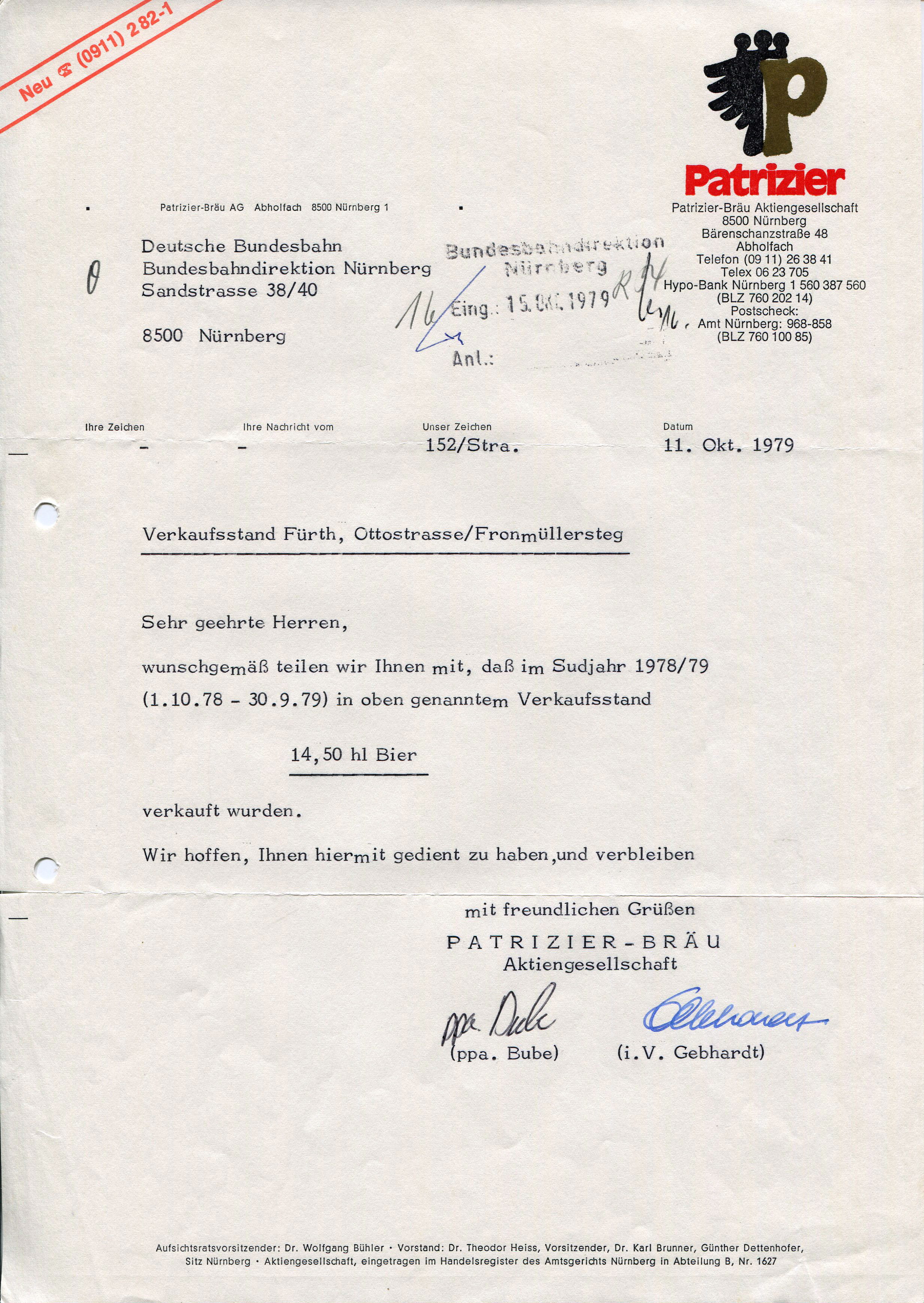 | Beschreibung | Briefkopf der Patrizier Brauerei über den Bierabsatz am Verkaufstand Ottostraße und Fronmüllersteg, 1979 | ||