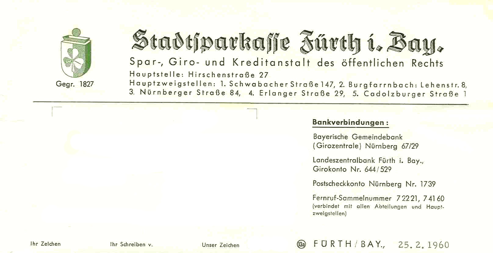| Beschreibung | Historischer Briefkopf der Stadtsparkasse Fürth von 1960 | ||