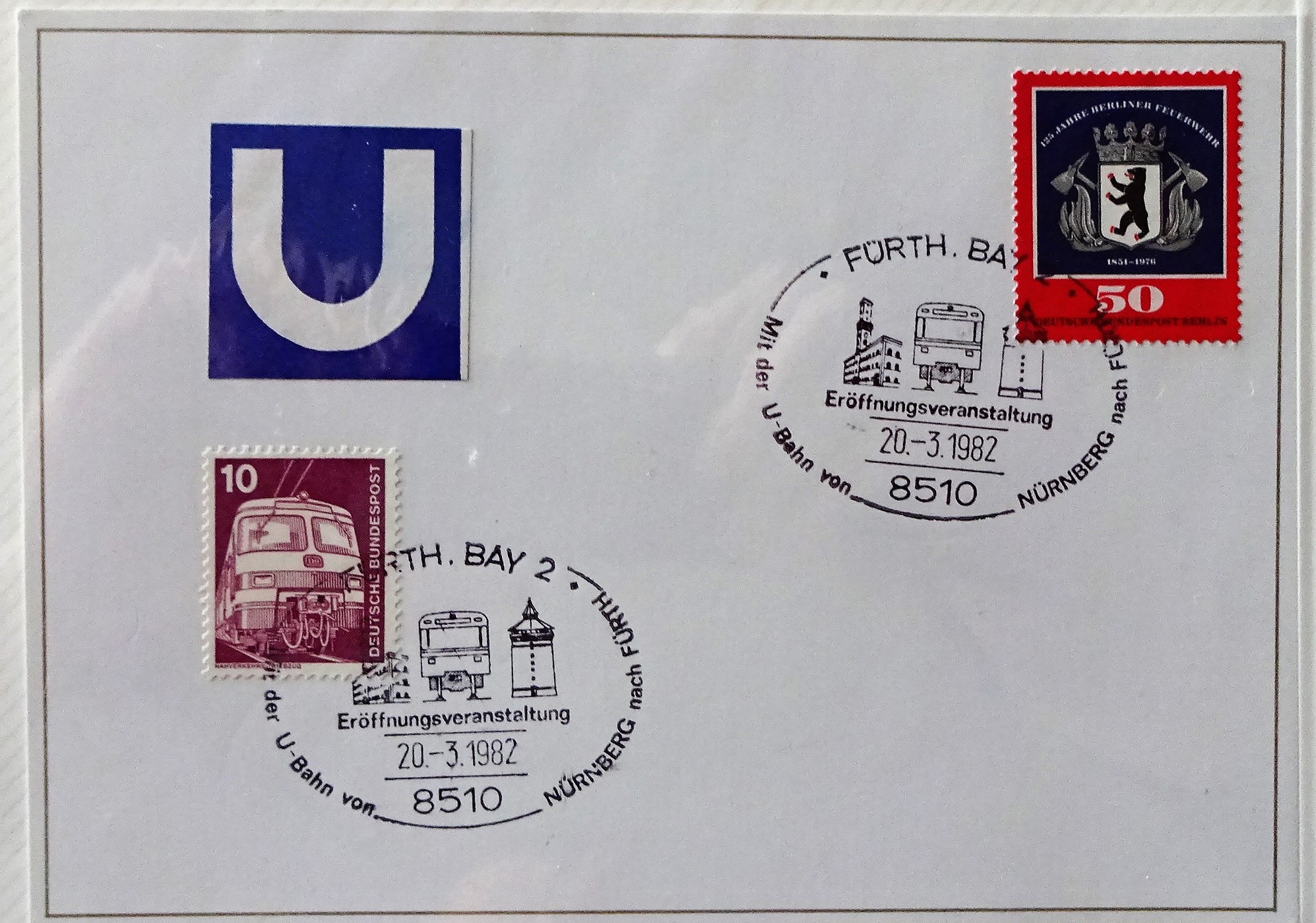 Briefmarken Sonderblatt mit Sonderstempel zur Eröffnung mit der U-Bahn von Nürnberg nach Fürth am 20.03.1982