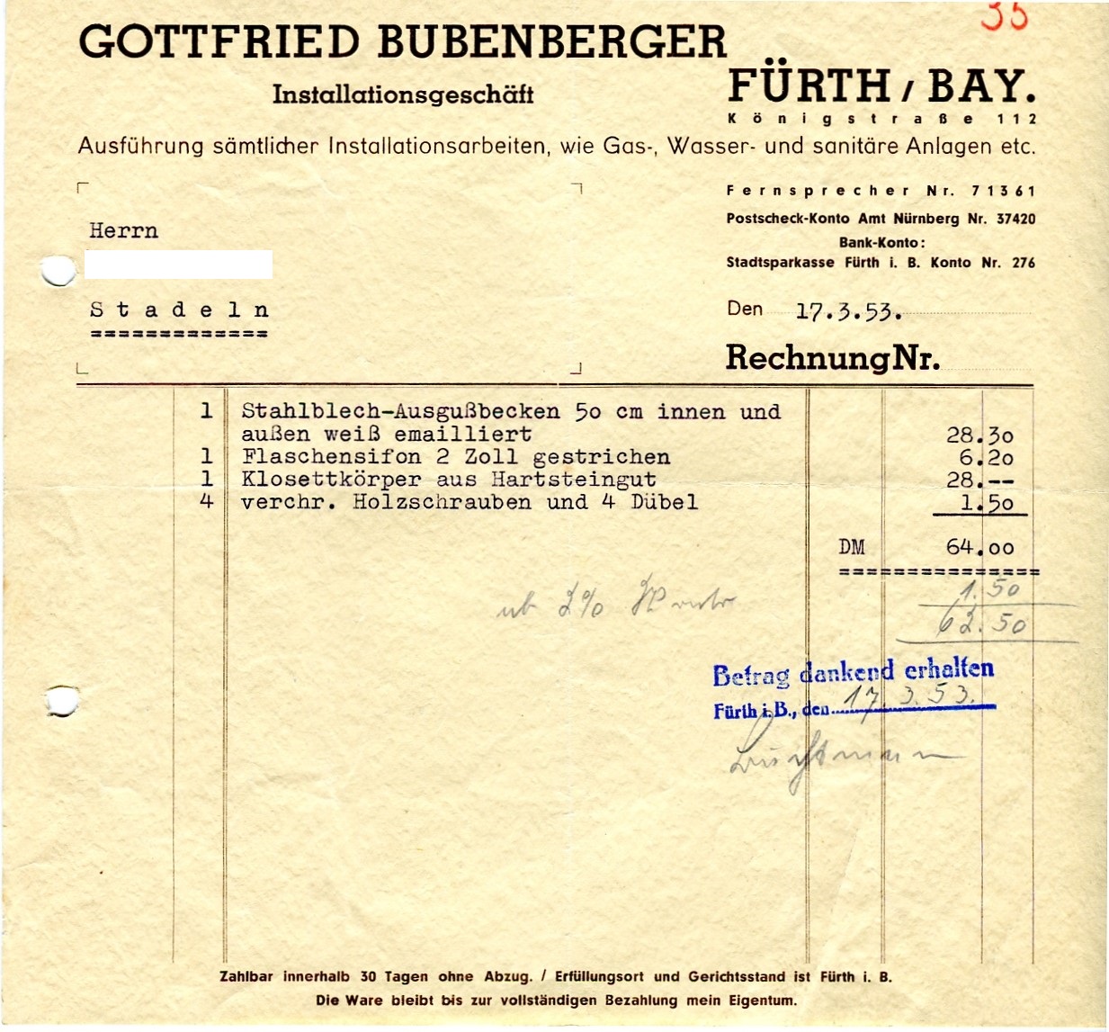 | Beschreibung | Rechnung vom 17.03.1953 der Firma Gottfried Bubenberger aus der Königstraße 112 | ||