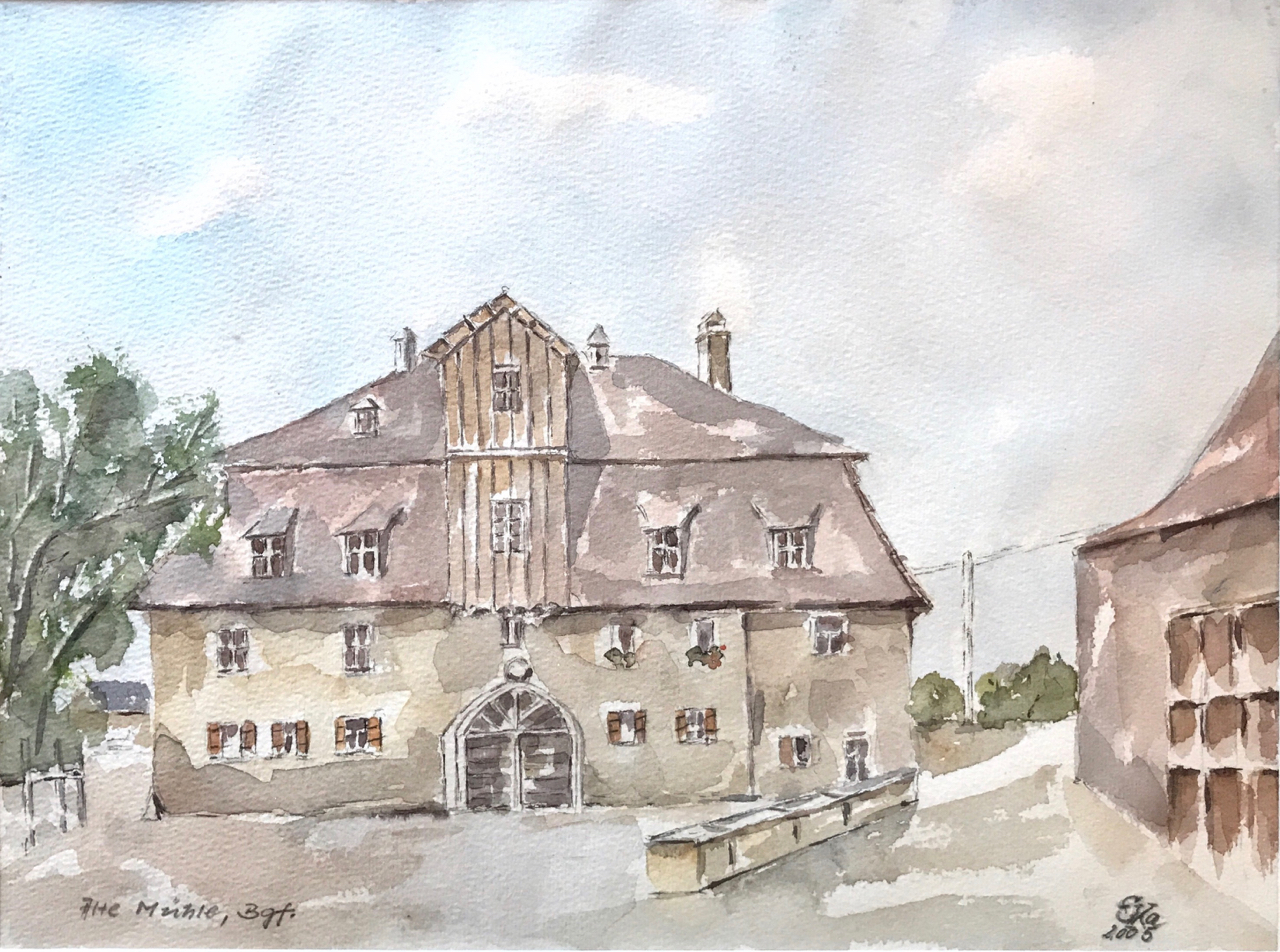 | Beschreibung | Alte Mühle Burgfarrnbach vor dem Brand von 1927 - Aquarell von Erwin Kaltenbacher nach histor. Foto (2005) | ||