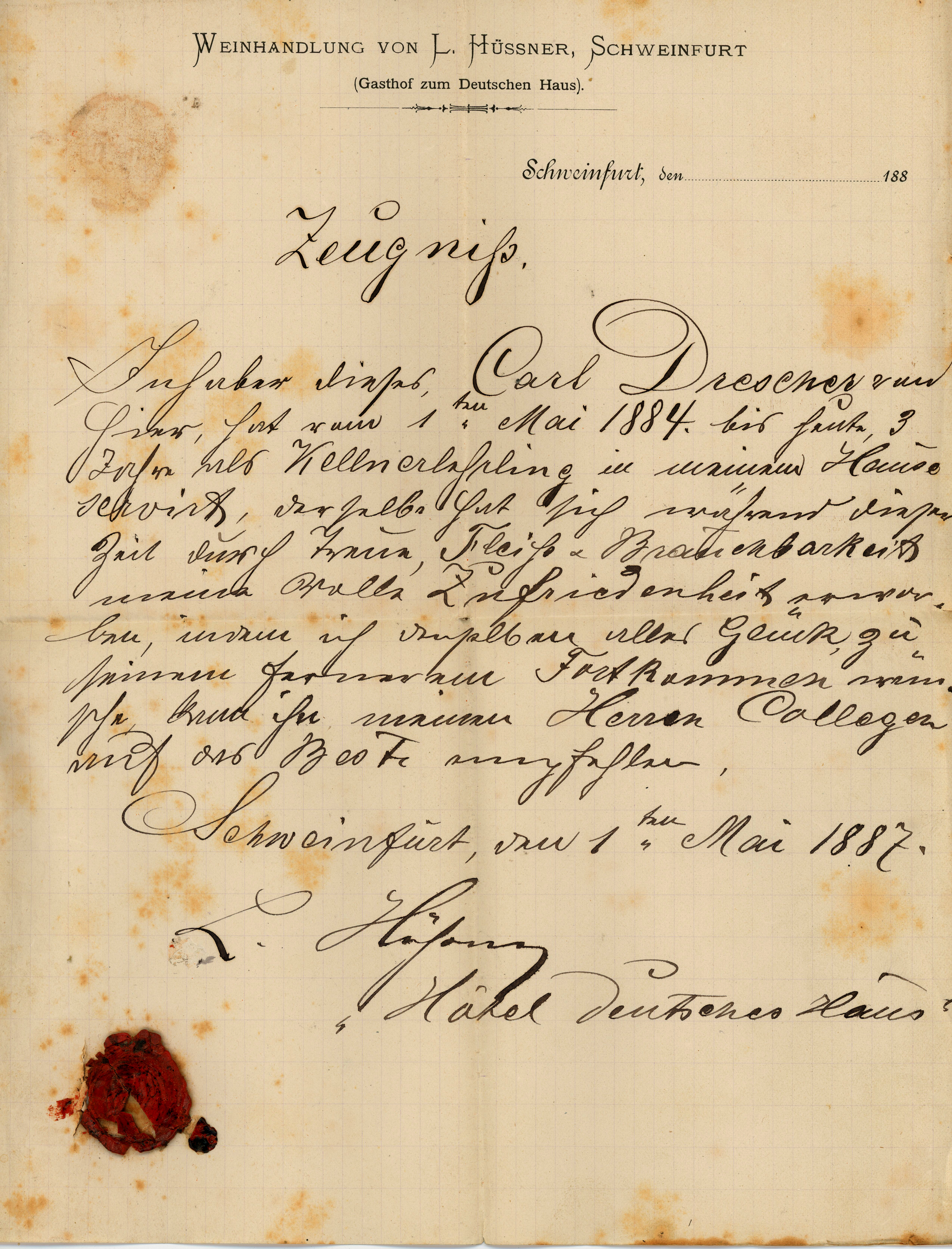 | Beschreibung | Zeugnis zur Kellnerlehre von Carl Drescher bei der Weinhandlung L. Hüssner in Schweinfurt - Gasthof zum Deutschen Haus, 1887 | ||