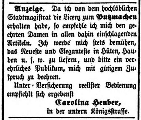 | Dateiinfo (Bild-Unterschrift und Info-Box, automatisch erstellt) | Tochter Caroline Heuber im Beutler- und Mützengeschäft, Ftgbl. 3.4.1855 Urheber: Fürther Tagblatt<br><br>Lizenz: CC BY-SA 3.0 | ||