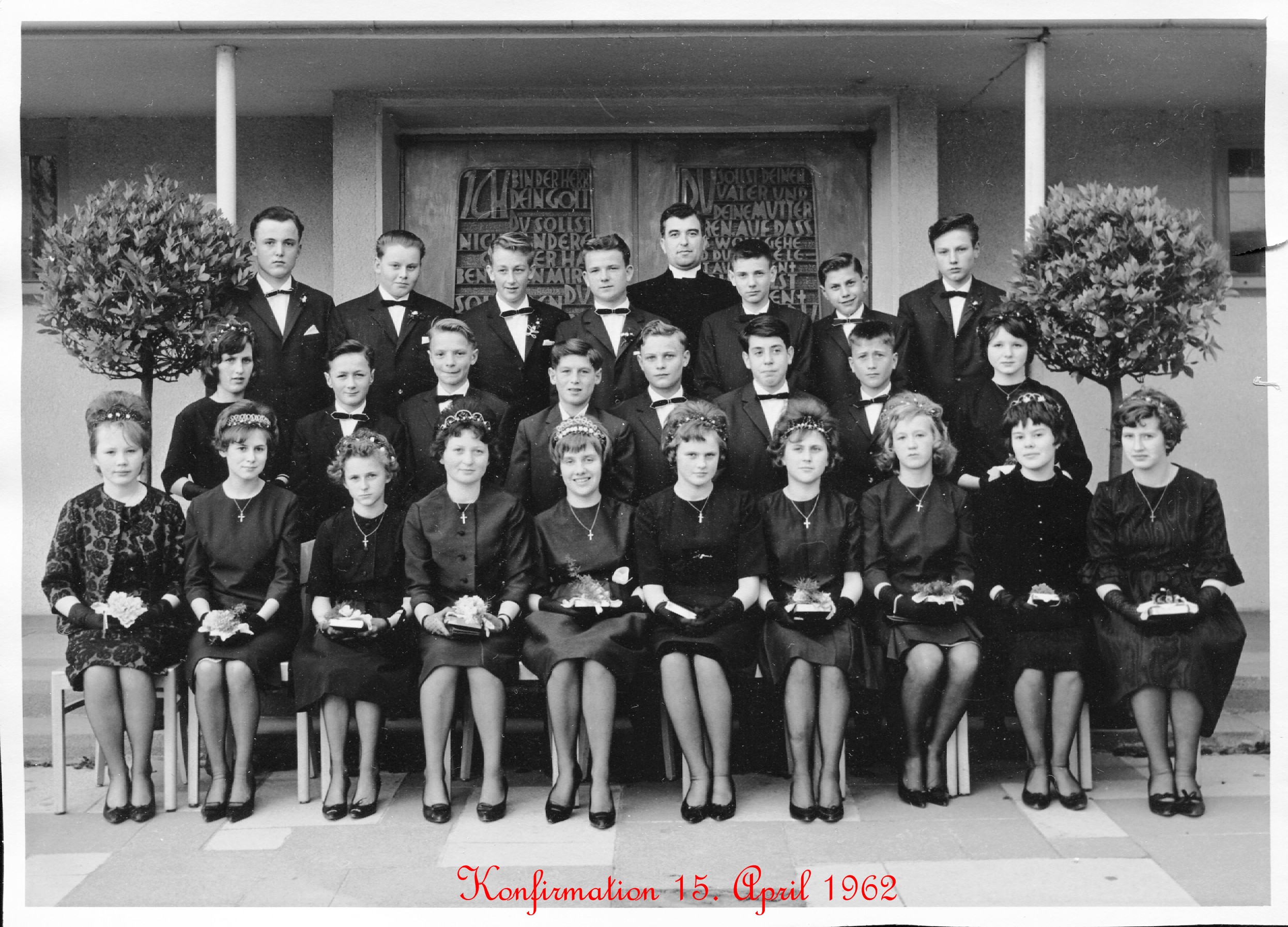 Konfirmanden 1962 mit Pfarrer Theodor Vogel vor dem Portal der Christuskirche Stadeln.