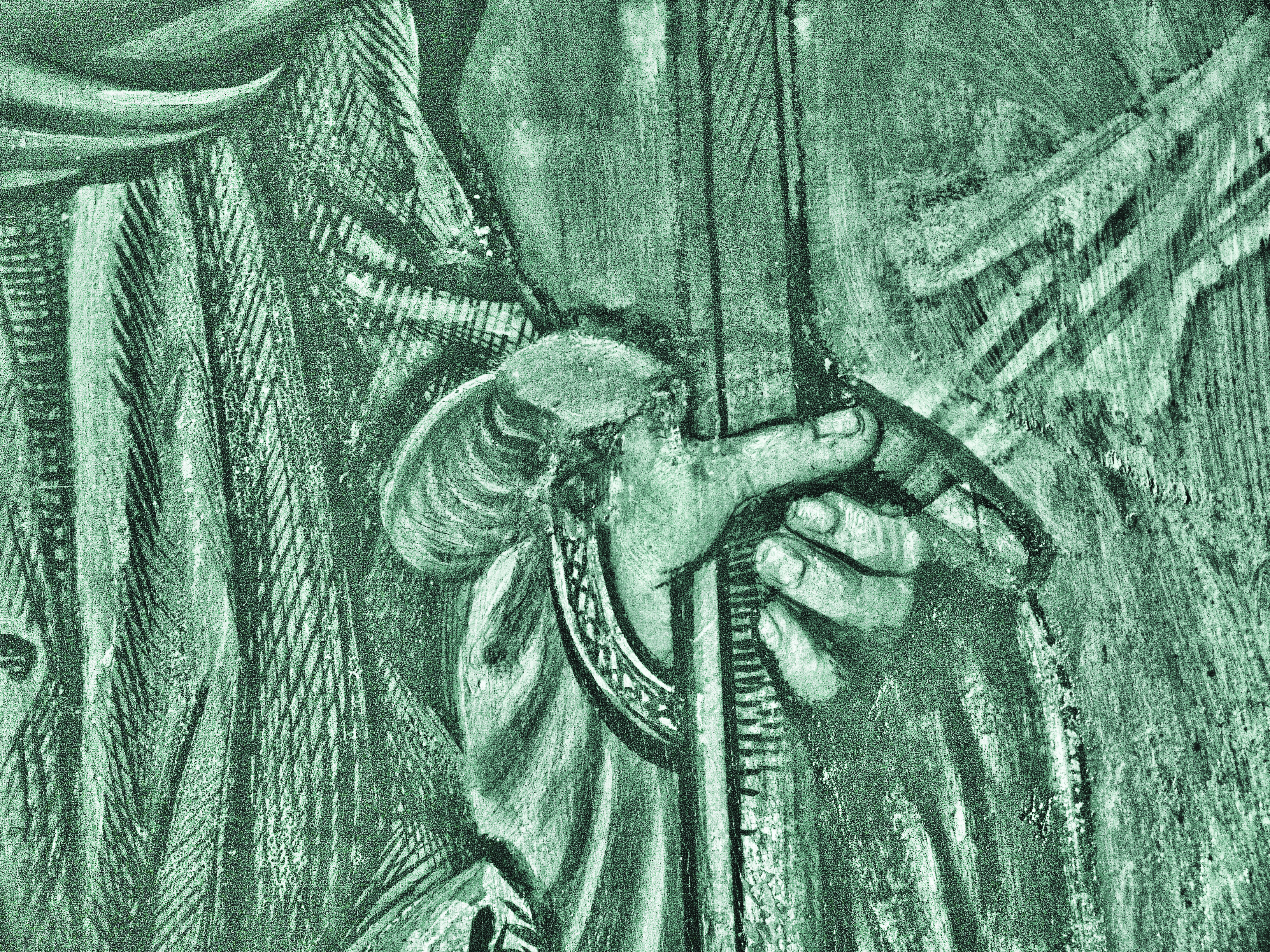 | Beschreibung | Infrarotaufnahme der Laurentiusfigur, die unter dem Rost Pfeilspitzen erkennen lässt | ||
